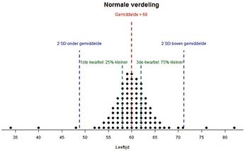 Alleen een gemiddelde of mediaan geeft geen compleet beeld van de populatie, omdat ze geen inzicht geven in hoe de waarnemingen zijn verdeeld. Daarom moet je ook kijken naar de spreidingsmaten zoals de range, de interquartile range (IQR) en de standaarddeviatie (SD). De range geeft aan wat de laagste en de hoogste waarde van de data zijn. De IQR is de afstand tussen de eerste en derde kwartiel: de grens van het eerste kwartiel is de waarde waarbij 25% van de data kleiner zijn; de grens van het derde kwartiel is de waarde waarbij 75% van de data kleiner zijn. Het nadeel van de range en de IQR is dat deze zijn gebaseerd op een beperkt aantal waarden. De SD neemt de locatie van álle waarden mee. Een grote SD betekent dat de waarnemingen gemiddeld verder van het gemiddelde afliggen en er dus veel spreiding is. Een kleine SD houdt in dat de waarden dicht rond het gemiddelde liggen. Als de data ‘normaal’ zijn verdeeld, ligt 68,2% van alle waarnemingen tussen 1 SD onder en 1 SD boven het gemiddelde en ongeveer 95% van alle waarnemingen tussen 2 SD onder en 2 SD boven het gemiddelde.