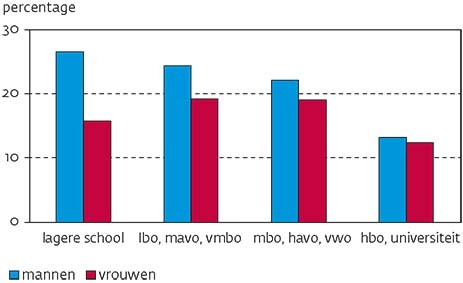 In de jaren vijftig van de vorige eeuw rookte meer dan 80% van de mannen en 30% van de vrouwen. In 2012 rookte 27% van alle mannen in Nederland van 15 jaar en ouder en 25% van alle vrouwen. Er bestaat zowel bij mannen als vrouwen een duidelijke relatie tussen opleidingsniveau en roken: de laagst opgeleide mannen hebben, vergeleken met de hoogst opgeleide mannen, een vier keer zo grote kans om roker te worden; bij vrouwen is die kans drie keer zo groot [figuur 1].