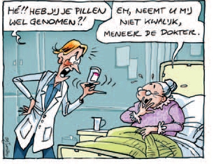In de meeste ziekenhuizen loopt het voltallige personeel tegenwoordig met een bordje op de borst waarop in elk geval de voornaam en de achternaam is te lezen. Vaak ontbreekt tot mijn grote ergernis de functie van de betrokkene. Dat leidt tot pijnlijke situaties waarin ik aan de zaalarts nog een kopje koffie vraag en aan de kantinejuffrouw uitgebreid de ontstoken plek in mijn lies laat zien… Die voornaam maakt de dingen ingewikkeld. De specialist stelt zich aan je voor als – ik zeg maar iets – ‘Henk van Leeuwen’, maar voor mij is hij (voorlopig nog) helemaal geen ‘Henk’. Ik antwoord daarom met ‘Van der Voort’, want voor hem ben ik nog in geen velden of wegen ‘Hans’.