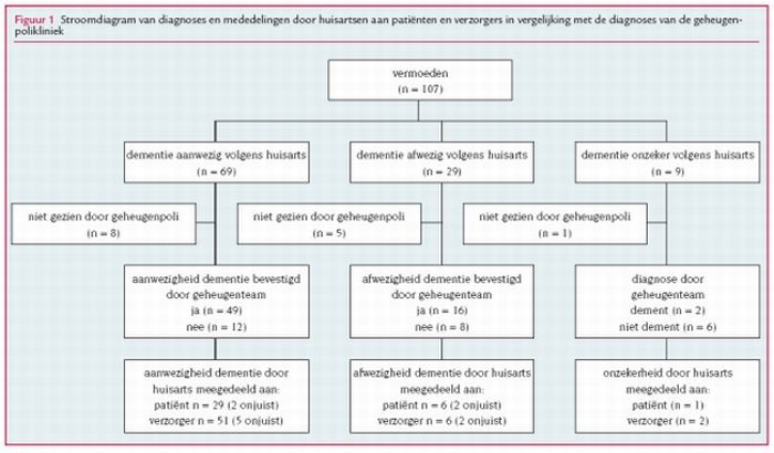 Resultaten In totaal registreerden de huisartsen 107 mogelijke gevallen van dementie. Bij 82 patiënten was de verzorger meegekomen. Bij nadere beoordeling achtten zij dementie aanwezig bij 69 personen, afwezig bij 29 personen en onzeker bij 9 personen. In de meeste gevallen was de diagnose van de huisarts juist; een onjuiste diagnose kregen twee mensen die volgens de geheugenpolikliniek niet aan dementie leden en twee mensen die er juist wel aan leden. De huisartsen deelden de diagnose mee aan 42% van de mensen met waarschijnlijke dementie en aan 74% van de verzorgers. Meestal vroegen zij wel naar de ervaringen van de verzorgers, maar in minder dan de helft van de gevallen gaven zij gericht advies. Alleen als de dementie tamelijk ernstig was, waren de huisartsen wat mededeelzamer, maar tegenover de patiënten vertoonden zij een veel grotere schroom om de diagnose mee te delen dan tegenover hun verzorgers.