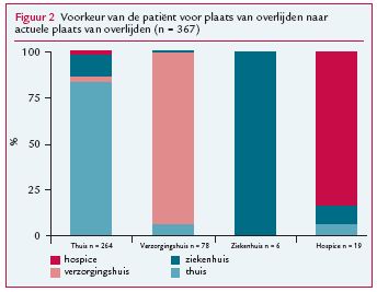 Bij de patiënten van wie bekend is waar ze willen overlijden wordt de wens meestal (> 80%) gehonoreerd (figuur 2). Dat geldt zeker (100%) voor de kleine groep (n = 6) die in het ziekenhuis wil overlijden, maar ook in hoge mate voor patiënten die thuis (83%), in het verzorgingshuis (92%) of in het hospice (83%) willen overlijden.