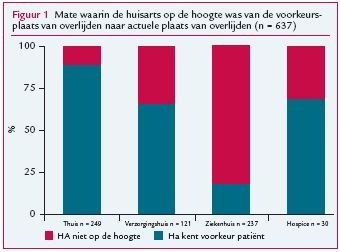 Van de geregistreerde 637 niet acuut overleden patiënten overleed 34% thuis, 16% in het verzorgingshuis, 40% in het ziekenhuis en 10% in een hospice of vergelijkbare voorziening. Bij 54% van deze overledenen was de huisarts op de hoogte van de voorkeursplaats van overlijden. Opvallend is dat huisartsen veel vaker op de hoogte waren van de wensen van patiënten met een hogere sociaal-economische status en van patiënten bij wie de zorg was gericht op palliatie en psychosociale behoeften (niet op genezing). Van de groep waarbij de huisarts op de hoogte was van de voorkeur wilden de meeste patiënten thuis (88%) overlijden, waaronder 19% in een verzorgingshuis. Slechts 12% wilde niet thuis overlijden: 10% in het hospice en 2% in het ziekenhuis. Dat doet vermoeden dat veel patiënten die in het ziekenhuis overlijden dat eigenlijk niet willen. Bij de groep die in het ziekenhuis overlijdt, is de huisarts overigens relatief het vaakst niet op de hoogte van de wensen van de patiënt (figuur 1).