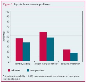 Resultaten Mensen met zeldzame aandoeningen ervaren een vrij slechte kwaliteit van leven. Veel van hen hebben seksuele problemen, psychische problemen, angsten en zorgen over de aandoening. Men blijkt over het algemeen tevreden over de huisartsenzorg en men voelt zich serieus genomen. Echter, een groot deel geeft aan dat de huisarts geen specifieke deskundigheid bezit over de aandoening.
