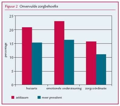 Ruim 90% van de onderzoeksgroep heeft ten minste één keer per jaar contact met de huisarts (niet in tabel). Mensen met een zeldzame aandoening zijn over het algemeen (zeer) tevreden over de manier waarop de huisarts werkt. Dat geldt ook voor mensen met een vaker voorkomende chronische aandoening (tabel 5). Meer dan 90% geeft aan dat de huisarts doelmatig werkt, dat hij hen laat meebeslissen over de behandeling en voldoende uitleg geeft over geneesmiddelen. Ook voelt vrijwel iedereen zich serieus genomen door de huisarts. Problemen doen zich wel voor ten aanzien van de specifieke deskundigheid van de huisarts. Ruim tweederde van de onderzoeksgroep geeft aan dat de huisarts geen specifieke deskundigheid bezit over hun aandoening, wat beduidend hoger is dan in de referentiegroep. Daarnaast zegt bijna 20% van de onderzoeksgroep dat de huisarts zich niet in hun leefwereld kan verplaatsen. Wel vindt bijna iedereen dat de huisarts altijd bereid is om over hun problemen te praten. Toch heeft 1 op de 5 mensen met een zeldzame aandoening behoefte aan meer of andere zorg van de huisarts en, meer in het algemeen, aan emotionele ondersteuning (23%: zie figuur 2). Daarnaast bestaat er bij 16% een behoefte aan meer zorgcoördinatie.