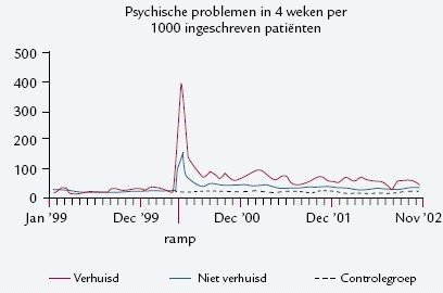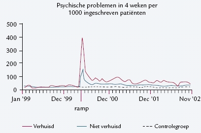 Psychische problemen kwamen voor de ramp even vaak voor bij de slachtoffergroepen als bij de controlegroep. Onmiddellijk na de ramp steeg de prevalentie van psychische problemen bij de groep verhuisde slachtoffers tot het vijftienvoudige en bij de andere slachtoffergroep tot het zesvoudige, terwijl deze bij de controlegroep niet veranderde (figuur 1). De prevalentie van psychische problemen daalde geleidelijk in de daaropvolgende periode, maar was tweeënhalf jaar na de ramp bij de verhuisde slachtoffers nog steeds het dubbele van die bij de controlegroep én ten opzichte van voor de ramp. Bij de niet-verhuisde slachtoffers was na tweeënhalf jaar de prevalentie 31% hoger dan in de controlegroep.