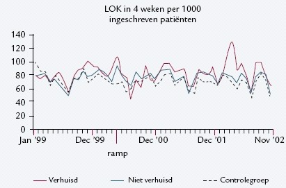Slachtoffers en controlepersonen die voor de ramp al psychische problemen hadden, kwamen na de ramp vier- tot zevenmaal zo vaak met psychische problemen als degenen die voor de ramp niet met psychische problematiek bij de huisarts waren geweest. Patiënten die voor de ramp al psychische problemen hadden en bovendien noodgedwongen moesten verhuizen, kwamen in de eerste 4 weken na de ramp het vaakst met psychische problemen bij de huisarts (750 per 1000). Beide groepen slachtoffers kwamen voor de ramp vaker bij de huisarts met LOK dan de patiënten uit de controlegroep (figuur 2). De verhuisde slachtoffers hadden onmiddellijk na de ramp een hogere prevalentie van LOK (104 per 1000 in 4 weken), en de prevalentie bleef tot het eind van het onderzoek verhoogd (88 per 1000 per 4 weken). Bij verhuisde slachtoffers trad een hoge piek van LOK op in april 2002 na de aanvankelijke vrijspraak van de eigenaren van SE Fireworks, een gebeurtenis die de nodige media-aandacht kreeg en veel emoties opriep. De prevalentie van LOK bij niet-verhuisde slachtoffers was constant gedurende de hele onderzoeksperiode (76 per 1000 in 4 weken). Hoesten, moeheid, nek-, rug- en schouderpijn waren de meest geuite klachten. Gastro-intestinale morbiditeit kwam vóór en gedurende de hele periode na de ramp vaker voor bij verhuisde slachtoffers (23 versus 18 per 1000 per 4 weken bij de controlegroep). Beide slachtoffergroepen toonden na de ramp een lichte toename, zowel vergeleken met de controlegroep als met het niveau van voor de ramp.