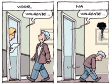 De dermatologe sloeg een arm om Hansjes schouders. Zij wist dat de peau de miroir van de ziel was en begreep dat er van die ziel en de bezitter daarvan niet veel meer over was. ‘Lieverd, wat kan ik voor je doen?’ vroeg ze, half onthutst, half meelevend. Hansje keek haar met grote rode ogen aan. Zijn ogen zwierven langs alle dozen met spullen, langs de scharen en pincetten en de glimmende apparaten, keken haar toen weer aan en hij stamelde: ‘Wilt u gewoon zeggen dat u het ook niet meer weet…?! Want uw collega’s zeggen toch weer wat anders!’ Hans van der Voort hvdvoort@knmg.nl