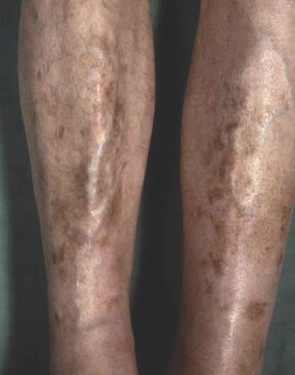 Dit is de meest voorkomende complicatie van diabetes, die optreedt bij ongeveer 40% van de patiënten die al jarenlang suikerziekte hebben. De laesies van dermopathie zijn meestal op de voorzijde van de onderbenen gelokaliseerd. In een periode van ongeveer een week ontstaan in aanvallen vier of vijf dofrode maculae of papels met een diameter van 5 tot 12 mm. Deze kunnen blijven bestaan of geleidelijk verdwijnen. De persisterende afwijkingen evolueren tot gehyperpigmenteerde, iets verzonken littekens (figuur 1). Diabetische dermopathie komt tweemaal zo vaak voor bij mannen als bij vrouwen. Je ziet het vooral bij patiënten die al andere orgaanschade door de diabetes hebben, zoals retinopathie, neuropathie en nierbeschadiging.3 Volgens sommige auteurs neemt de kans dat een patiënt diabetische dermopathie krijgt toe als er sprake is van microangiopathie, maar ook niet-diabetici kunnen identieke laesies krijgen. De aanwezigheid van vier of meer laesies bij een niet met diabetes bekende patiënt, duidt op diabetes.4 Er zijn geen effectieve behandelingen bekend.