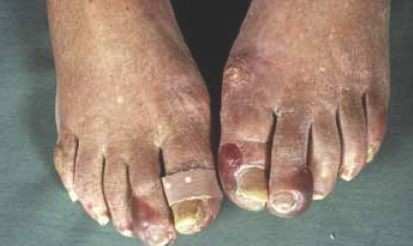 2. ‘Het lijkt wel of ik drie keer de vierdaagse gelopen heb’, zegt de 57-jarige, licht adipeuze mevrouw Van Doorn. ‘Sinds een paar dagen heb ik toch een blaren op mijn voeten.’ In haar probleemlijst staat dat zij een goed gereguleerde diabetes mellitus heeft en een licht verhoogd cholesterol. Hypertensie heeft ze niet. Op haar tenen en de voetrand zie ik enkele grote rode blaren die met vocht gevuld zijn. De huid rondom is wat rood en schilferig (figuur 2). Verder zie ik geen duidelijke afwijkingen aan haar voeten, maar zij heeft waarschijnlijk wel schimmelnagels. De blaren zijn niet pijnlijk en de sensibiliteit van de voeten is ongestoord. Waar komen die blaren plotseling vandaan? Is het misschien een reactie op een schimmel (pompholyx)? Ze heeft echter niets aan de handen. En een bulleus geneesmiddelexantheem is waarschijnlijk wel erg vergezocht, laat staan een parapemphigus. Is het misschien een teken van een – potentieel ernstige – infectie en moet ik een straffe antibioticakuur voorschrijven? Of zou het toch met de ‘suiker’ te maken hebben?