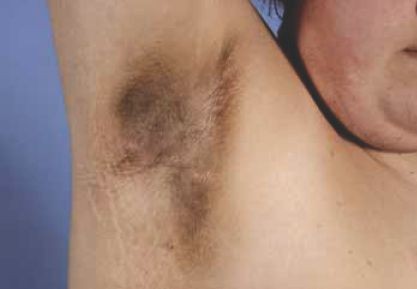 Acanthosis nigricans (AN) kenmerkt zich door hypertrofische, gehyperpigmenteerde fluweelachtige plaques in de plooien, vooral de oksels en de nek (figuur 4 en 5). Ook in de liezen, de navel, op de areolae, onder de borsten en zelfs op de handen kan acanthosis nigricans optreden. AN kan zich beperken tot een milde gelokaliseerde verkleuring, maar kan ook gegeneraliseerd zijn. Meestal is de aandoening asymptomatisch, maar wanneer de huid gemacereerd raakt, zijn de laesies vaak pijnlijk en kunnen ze onaangenaam ruiken. AN wordt onderverdeeld in een benigne en een maligne variant. De benigne variant komt het meest voor bij patiënten met diabetes mellitus type 2. Daarnaast kan het ook voorkomen bij obesitas6, het polycysteusovariumsyndroom7, acromegalie en bij het Cushing-syndroom. Bij al deze aandoeningen bestaat er resistentie tegen endogeen insuline. De pathogenese van AN hangt waarschijnlijk samen met de hierbij optredende hoge spiegels van circulerend insuline, dat kruisreageert met en zich bindt aan de receptoren van de structureel verwante insulineachtige groeifactor (insulin-like growth factor) op keratinocyten en dermale fibroblasten, waardoor de groei van deze cellen gestimuleerd wordt.8 De maligne vorm van AN is een paraneoplastisch verschijnsel bij een maligniteit en is tamelijk zeldzaam. De laesies zijn ernstiger en uitgebreider dan bij de benigne acanthosis nigricans. Er is een opvallende pigmentatie die niet beperkt is tot de hyperkeratotische gebieden. De handpalmen zijn dikwijls verdikt en de nagels kunnen broos zijn. De slijmvliezen zijn vaak bij het proces betrokken en rond de ogen en mond ziet men wel een wratachtige papillomatosis. Bij de maligne vorm is er meestal sprake van een onderliggend adenocarcinoom, vooral van de maag. Andere tumoren ziet men ook, bijvoorbeeld carcinomen van de oesofagus, het rectum, de bronchiën, de urinewegen, de galwegen en de schildklier. Klinisch en histopathologisch zijn de benigne en de maligne vorm niet altijd van elkaar te onderscheiden. Bij verdenking op AN zoekt men eerst naar diabetes en andere mogelijke oorzaken van insulineresistentie. Zijn deze aandoeningen uitgesloten, dan moet men onderzoek doen naar een mogelijk onderliggende maligniteit.