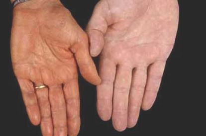 In zeldzame gevallen kan de huid van patiënten met diabetes een gelige teint hebben als gevolg van afzetting van carotenoïden in het bindweefsel van de huid (figuur 8). Carotenoïden zijn pigmenten die aanwezig zijn in groene en gele groenten; bij diabetici zijn de waarden van carotenoïden in het bloed vaak verhoogd. Een gelige verkleuring van de huid kan ook voorkomen bij hypothyreoïdie, hypogonadisme, hypopituïtarisme, boulimia en anorexia nervosa.