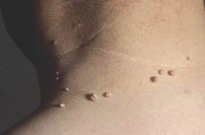Skin tags zijn kleine slappe fibroompjes die in aantal toenemen met de leeftijd en gelokaliseerd zijn op de oogleden, in de hals en nek, onder de oksels en in de liezen (figuur 9). Volgens diverse onderzoekers heeft meer dan 50% van de patiënten met uitgebreide erupties van skin tags diabetes mellitus type 2. Bij dergelijke patiënten lijkt onderzoek daarnaar dan ook nodig.12 De laesies kunnen goed met de hyfrecator worden weggebrand.