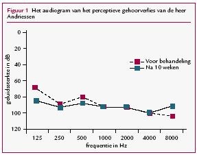 De heer Andriessen, 45 jaar, meldde zich bij zijn huisarts in verband met een acuut ontstaan gehoorverlies van het rechteroor. Dit gehoorverlies, dat drie weken tevoren was ontstaan, ging gepaard met tinnitus. Hij had geen otalgie, otorroe, koorts of vertigoklachten en was verder gezond. Vier jaar geleden had hij een soortgelijke episode van gehoorverlies doorgemaakt, waarbij de klachten alleen minder ernstig waren dan nu. Het gehoor kwam toen binnen enkele weken spontaan weer terug. Daarom kwam hij deze keer pas laat bij zijn huisarts. De huisarts zag bij het otologisch onderzoek geen verklaring voor het gehoorverlies en verwees naar de KNO-arts in het plaatselijk ziekenhuis. De KNO-arts stelde een perceptief gehoorverlies vast en verwees door naar ons centrum. Bij otoscopie zagen wij beiderzijds een normaal trommelvliesbeeld en een luchthoudend middenoor. Ook het overige KNO-onderzoek was zonder afwijkingen. Het audiogram liet aan het rechteroor een vrij vlak perceptief verlies zien van 80-100 dB ( figuur 1). Er werd met dit oor geen spraakverstaan bereikt. De functie van het linkeroor was, voor de leeftijd, normaal. Ook het tympanogram was beiderzijds normaal. Laboratoriumonderzoek (Hb, Ht, leuko’s, diff, BSE, CRP, ASAT, ALAT, AF, ureum, creatinine, TSH) en het serologisch onderzoek (cytomegalovirus, Epstein-Barr-virus, herpes-simplexvirus, varicella-zostervirus, Toxoplasma gondii en Treponema pallidum) toonden geen afwijkingen. Ook het immunologisch onderzoek (ANCA, ANF) was niet afwijkend. Hoewel het gehoorverlies al langer dan 14 dagen bestond, behandelden wij de heer Andriessen met prednisolon 1 mg/kg per os, gedurende een week. Omdat een MRI-scan van de brughoek, die wij na een week lieten maken, geen retrocochleaire afwijkingen liet zien, stelden wij de diagnose IPPG. De heer Andriessen kreeg gedurende een halfjaar audiometrisch onderzoek. Helaas bleef hij zijn gehoorverlies houden. Bij de laatste controle had hij nog steeds een perceptief gehoorverlies van gemiddeld 90 dB in het rechteroor en hiermee kwam hij niet tot spraakverstaan.