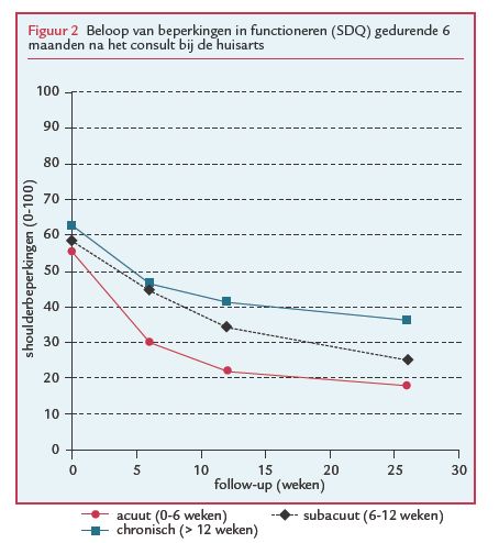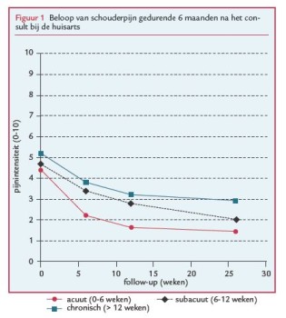 De resultaten van ons onderzoek geven aan dat het beloop van de klachten gunstiger is bij patiënten die bij de huisarts komen met kortdurende schouderklachten (gemiddelde afname na 6 maanden: 70%) dan bij patiënten met subacute (gemiddelde afname 54%) of chronische schouderklachten (gemiddelde afname 44%). Beperkingen in het dagelijks functioneren laten hetzelfde patroon zien. De ernst van pijn bij het eerste consult is een belangrijke prognostische factor bij zowel acute als chronische schouderklachten. Psychologische factoren lijken vooral bij chronische schouderklachten een rol te spelen.