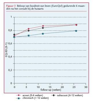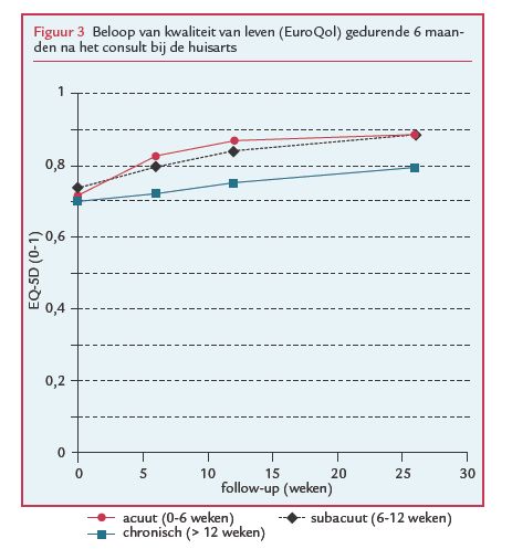 Figuur 1 laat zien dat het beloop van de pijn bij patiënten met acute schouderpijn het gunstigst is, met een daling van de gemiddelde score van 4,3 (sd 2,6) naar 1,3 (sd 2,2) na 6 maanden (gemiddelde afname 70% sinds de voormeting). De gemiddelde afname van pijn was 54% bij patiënten met subacute schouderklachten en 44% bij chronische schouderklachten. De resultaten met betrekking tot beperkingen in het dagelijks functioneren (figuur 2) vertonen dezelfde patronen, met de grootste afname in beperkingen bij acute schouderklachten (gemiddeld 69%). Resultaten voor de EQ-5D (figuur 3) laten zien dat er gedurende follow-up slechts kleine veranderingen in kwaliteit van leven plaatsvonden. Gemiddelde scores waren op elk meetmoment iets lager voor patiënten met chronische schouderpijn. Voor elke uitkomstmaat geldt dat de verschillen tussen de drie subgroepen op elk moment van follow-up statistisch significant waren.