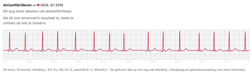 Huisartsen maken veelvuldig gebruik van ecg’s en interpreteren deze redelijk adequaat. Extra scholing zou dit nog kunnen verbeteren. Huisartsen zullen in de nabije toekomst steeds meer te maken krijgen met m-healthtoepassingen om aandoeningen vroegtijdig in de extramurale setting in beeld te brengen. De ontwikkelingen gaan hard, maar de meerwaarde van zulke screenings moet nog worden aangetoond en die stap kost meestal relatief veel tijd. Aan de (non-)indicaties voor een ecg zullen deze nieuwe toepassingen weinig veranderen, maar ze kunnen wel het gebruiksgemak en de inzetbaarheid van ritmeregistraties vergroten. Daar kan de huisarts zijn voordeel mee doen, niet in de laatste plaats omdat patiënten er zelf mee komen. Tijdens het schrijven van dit artikel meldde zich voor het eerst een (75-jarige) patiënt bij ons met zelf vastgelegd atriumfibrilleren; zijn mobiele telefoon had hem doorverwezen naar de huisarts [figuur].