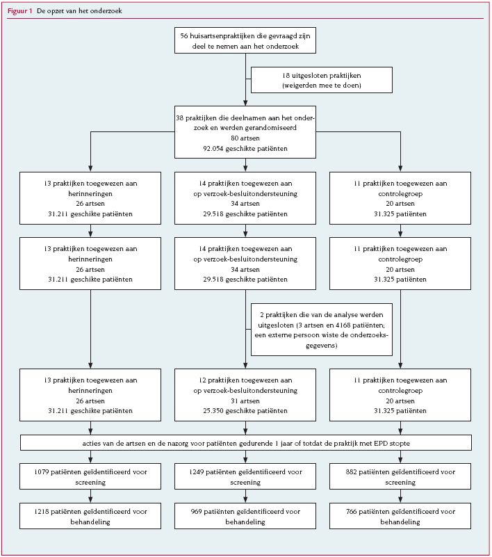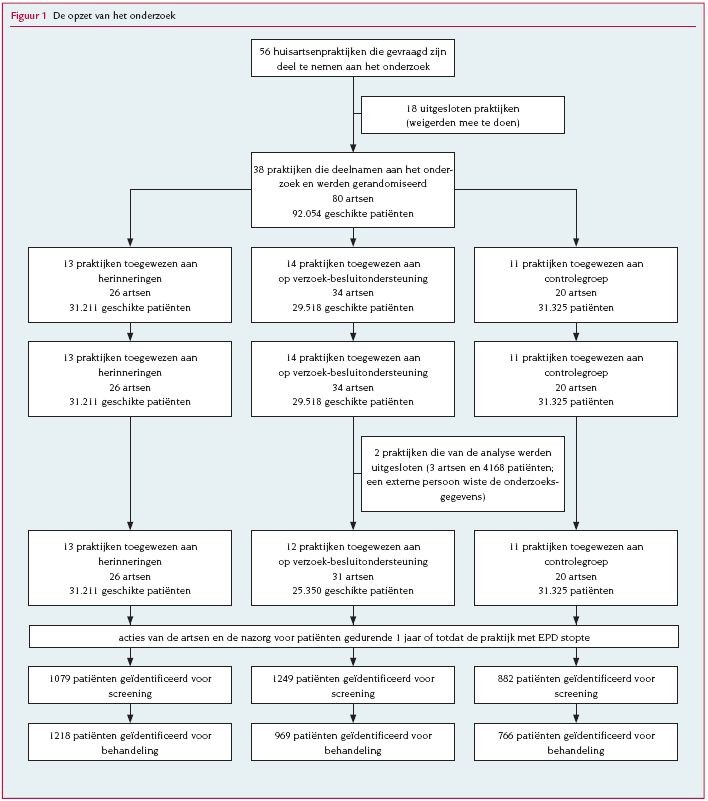 Ons op praktijkniveau gerichte, clustergerandomiseerde, gecontroleerde onderzoek vergeleek de effecten van herinneringssystemen of op-verzoeksystemen met die van de normale zorg. We wezen de huisartsenpraktijken toe aan een van de drie groepen en volgden de resultaten van de patiënten in de toegewezen groepen. Tussen mei en juni 2004 nodigden we alle 56 praktijken in Delft en omgeving uit die Elias EPD (iSoft bv) gebruikten voor deelname aan het onderzoek. We kozen ervoor om onze interventie te integreren in één EPD, om zo een mogelijke bias te vermijden als gevolg van een verschil in EPD-techniek. Alleen praktijken die hun papieren dossiers volledig hadden vervangen door een elektronisch dossier en die langer dan één jaar op deze wijze hadden gewerkt, lieten we tot het onderzoek toe.