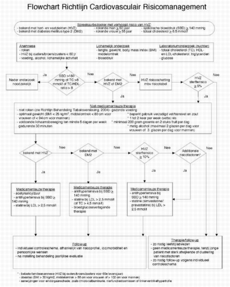 Het stroomdiagram dat Ariane van Hintum heeft ontwikkeld is vrijwel identiek aan dat van het CBO. Om te voorkomen dat er verschillende versies in omloop raken, wordt onderstaand het CBO-stroomdiagram afgebeeld. Hiermee is dus niets gezegd over de kwaliteit die Ariane heeft geleverd in haar werk. Integendeel! Een NHG-staflid verwoordde het als volgt: ‘Leuk dat deze aios dit onderzoek heeft gedaan en is gekomen tot een flowchart die in de praktijk handig lijkt te zijn. Deze komt vrijwel overeen met de flowchart die het CBO in samenwerking met het NHG heeft gemaakt bij de richtlijn Cardiovasculair risicomanagement. Is die ook gebruikt voor het schema van deze aios? Zo niet, dan heeft zij een goed voorgevoel gehad.’