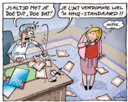 Niemand zal betwisten dat de NHG-Standaarden buitengewoon belangrijk zijn. Zij zitten knap in elkaar, zijn weloverwogen, voorzien van een uitgebreid notenapparaat (tegenwoordig helaas alleen online), en veel te lang en te saai voor de gehaaste huisarts. Neem, om een voorbeeld te noemen, de recente standaard over mictieklachten bij mannen.1 Niets mis mee, met zelfs belangwekkend nieuws dat de kranten had behoren te halen, maar het was wel weer erg doe-dit-doe-dat. ‘Vraag naar ...’, ‘Wees bij de hulpvraagverheldering alert op ...’ ‘Ga verder na of er sprake is van ...’ ‘Verricht …’, ‘Maak …’, ‘Bespreek …’. Het is, kortom, een waslijst aan gebiedende wijzen enkelvoud, een serie aanwijzingen die moeilijk te onthouden is, en nog moeilijker te implementeren.