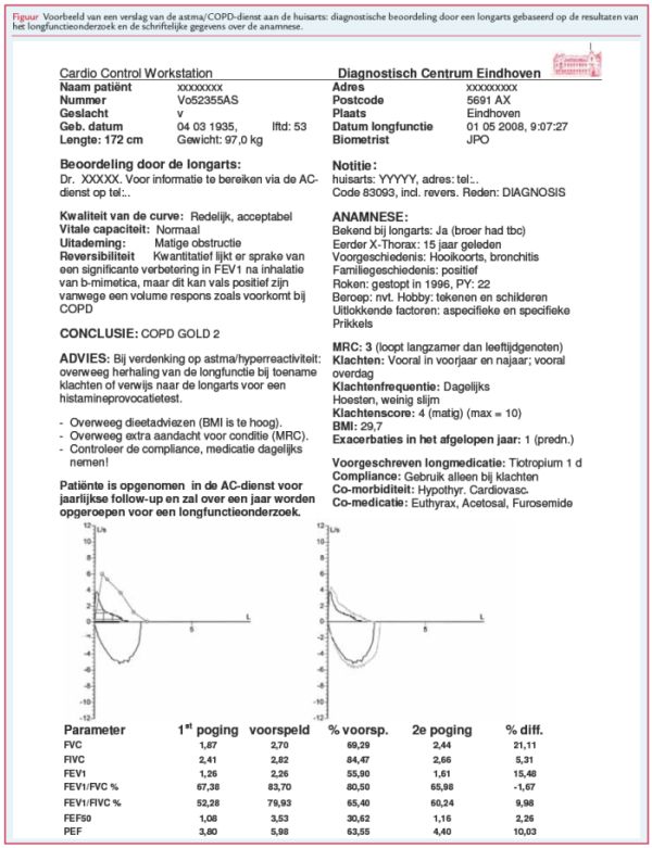 Sinds de publicatie van de eerste NHG-Standaarden over astma/COPD is de aanbevolen frequentie voor longfunctiemetingen verlaagd en heeft de anamnese weer aan belang gewonnen. Desondanks blijft het bij de diagnostiek van astma en COPD essentieel om longfunctiemetingen uit te voeren en te interpreteren.1 Artsen ervaren dit als complex.23 Het vraagt materiaal, ruimte, tijd, scholing en oefening: randvoorwaarden die niet altijd aanwezig zijn. Daardoor gebruikt men apparatuur vaak niet of verkeerd en zien we foute diagnoses in de eerste lijn.45678 Praktijkondersteuners die in spirometrie zijn geschoold dragen ongetwijfeld bij aan de oplossing.910 Huisartsen kunnen de beoordeling van longfunctiemetingen ook trainen, al lijkt dit vooral succesvol bij de duidelijke casuïstiek en minder bij de twijfelgevallen die juist in de eerste lijn veel voorkomen.11 Bovendien kleven er praktische bezwaren aan: de tijdsinvestering, continue nascholing en kwaliteitsbewaking. Deze bezwaren blijven altijd bestaan en bemoeilijken wereldwijd de implementatie van spirometrie in de huisartsenpraktijk.12 De internationale zoektocht naar oplossingen heeft geleid tot verschillende faciliteiten die de huisartsenpraktijken ondersteunen.1314 In Nederland zijn dit de astma/COPD-diensten (AC-diensten).15 Deze diensten voeren longfunctiemetingen uit en nemen een standaard anamnese af. Longartsen of deskundige (kader)huisartsen beoordelen de gegevens en de dienst stuurt een verslag naar de huisarts. Zie de figuur voor een voorbeeld van zo’n verslag.