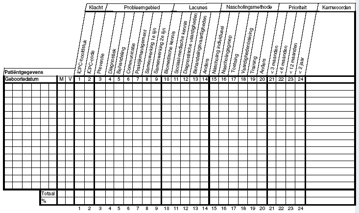 Onderstaand schema kan u en uw collega behulpzaam zijn bij het vinden van uw beider leerpunten. Aan de hand van de tijdens uw consulten gemaakte aantekeningen noteert u in de eerste kolommen bij wie u tijdens het consult bent gestuit op een lacune, en op welk (ICPC-)gebied zich dit voordeed. Samen met uw collega bekijkt u vervolgens wat het ‘probleemgebied’ is: preventie, diagnostiek, behandeling of nog anders? Is dat vastgesteld, dan kan worden bekeken aan wat voor soort vaardigheid het schort. Bij de keuze van de nascholingsmethode is het van groot belang dat u van uzelf weet welke manier van leren voor u het meest succesvol is. De een leert door lezen, de ander door zien, nummer drie door horen en nummer vier door doen. Voor iedereen geldt echter dat een combinatie van leermethoden het meest effectief is. Probeer waar mogelijk rekening te houden met uw persoonlijke favoriete leerwijze. Tot slot worden enkele leerdoelen geselecteerd en geprioriteerd. Zorg ervoor dat uw leerplan haalbaar is, maar stel uw eisen ook weer niet te laag. Sommige onderwerpen zijn met het lezen van een paar artikelen op peil te brengen, andere vergen zowel nascholing als oefening. Er is dan ook geen ‘ideaal aantal onderwerpen’ vast te stellen; u weet zelf wel wat u aankunt en hoeveel u wilt aanpakken.