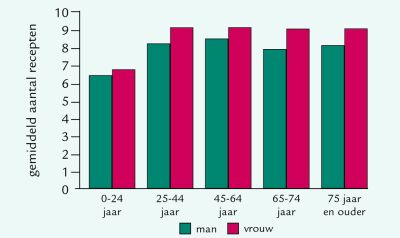 In de jaren 1999-2000 kreeg 5% van alle patiënten in de huisartspraktijk een antidepressivum voorgeschreven. Meer vrouwen (7%) dan mannen (3,5%) gebruikten een antidepressivum. Meer ouderen dan jongeren kregen een recept en meer ziekenfondspatiënten dan particulier verzekerden. Ook het aantal recepten dat patiënten kregen voorgeschreven verschilt. Vrouwen kregen gedurende de twee jaren gemiddeld één recept meer dan mannen: respectievelijk 9 en 8 recepten ( figuur 2). Jongeren tot 24 jaar kregen minder recepten dan patiënten van 25 jaar en ouder.