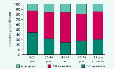Volgens de richtlijnen in de NHG-Standaard moeten patiënten het gebruik van antidepressiva voortzetten tot ten minste zes maanden na het verdwijnen van de klachten, tenzij er na acht weken geen effect merkbaar is. Als de geneesmiddelen aanslaan, zou een patiënt dus ten minste een half jaar antidepressiva moeten gebruiken. Dat gebeurt niet altijd. Voor patiënten die tussen juli 1999 en juli 2000 een recept kregen, is nagegaan in hoeveel aaneengesloten kwartalen in 1999 en 2000 dat het geval was. Een derde van deze patiënten kreeg een half jaar of minder een antidepressivum voorgeschreven. Meer dan de helft van de patiënten ontving drie tot acht kwartalen een recept. Vijftien procent kreeg over meerdere kwartalen een antidepressivum voorgeschreven, maar met onderbrekingen: de incidentele gebruikers. Mannen en vrouwen kregen voor een even lange periode antidepressiva voorgeschreven. Er zijn wel verschillen naar leeftijd ( figuur 3). Patiënten van 25 jaar en ouder gebruikten over het algemeen langer antidepressiva dan patiënten onder de 25 jaar.