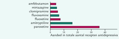 De NHG-Standaard Depressie (M44) uit 1994 beveelt tricyclische antidepressiva (TAD's) aan als een patiënt een ernstige depressie heeft, bij voorkeur in combinatie met een vorm van psychotherapie. In bepaalde gevallen, bijvoorbeeld bij ernstige bijwerkingen, heeft de serotonineheropnameremmer (SSRI) fluvoxamine de voorkeur. De afgelopen jaren volgden huisartsen deze voorkeur niet meer ( figuur 1). Paroxetine, een SSRI dat in 1991 op de markt kwam, is in de jaren 1999 en 2000 met een aandeel van 36% het meest voorgeschreven antidepressivum. Op de tweede plaats staat amitryptyline, de eerste keus TAD (17%). Fluvoxamine neemt de vierde plaats in (7%).