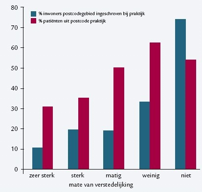 In plattelandsgebieden is dat in redelijke mate het geval (figuur). Gemiddeld heeft de huisartsenpraktijk hier meer dan 50% van de patiënten in het postcodegebied van het praktijkadres. Het gaat dan om gebieden met gemiddeld 3000 mensen van wie 74% bij de betreffende praktijk is ingeschreven. In sterk verstedelijkte gebieden ligt dit anders. De postcodegebieden omvatten meer inwoners: gemiddeld 8000. Desondanks heeft de huisarts slechts 31% van zijn patiënten binnen het postcodegebied van het praktijkadres. Van de inwoners van het postcodegebied is gemiddeld slechts 11% bij de praktijk ingeschreven.