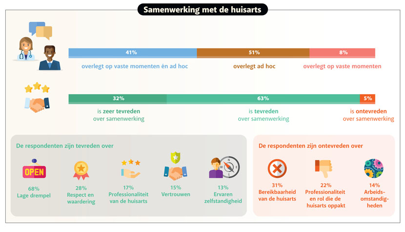 Gewenste verbeterpunten zijn: een vast overlegmoment met de huisarts, vermindering van de werkdruk, nascholing en intervisiebijeenkomsten onder werktijd.