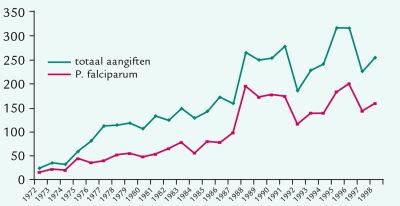 Malaria was een aangifteplichtige ziekte uit categorie B, welke binnen 24 uur moest worden aangegeven bij de GGD door de arts die de diagnose had vastgesteld. In de afgelopen jaren werden per jaar gemiddeld een kleine 300 gevallen officieel geregistreerd bij de Geneeskundige Hoofdinspectie. Stel dat daarvan ongeveer 200 patiënten zich in eerste instantie met hun klachten tot de huisarts hebben gericht, dan moeten we aannemen dat de 7000 Nederlandse huisartsen per jaar ongeveer 2000 keer de diagnose malaria overwegen; dat wil zeggen gemiddeld één verdachte patiënt per huisarts per drie jaar en één echte malaria-patiënt per 30 jaar ofwel gemiddeld éénmaal per carrière. De verdeling is natuurlijk niet homogeen over het land en een huisarts in de Bijlmer zal vaker aan malaria denken omdat veel van zijn patiënten met koorts uit de tropen afkomstig zijn en zo nu en dan hun land van herkomst bezoeken. Deze groep treft veelal geen maatregelen om malaria te voorkomen terwijl tijdens hun verblijf in Nederland hun natuurlijke weerstand tegen malaria sterk is afgenomen. Om die enkele patiënten draait het allemaal. Maar zijn het er echt zo weinig? Aanzienlijke onderrapportage van malaria door artsen is in vele landen beschreven. Sinds 1 april 1999 zijn de behandelend artsen ontheven van de aangifteplicht voor malaria. Met de invoering van de nieuwe Infectieziektewet berust de meldingsplicht voor malaria bij het hoofd van het diagnosticerend laboratorium (categorie C). Vooruitlopend op de wetswijziging over melding door de laboratoria hebben wij een onderzoek gedaan naar het werkelijke vóórkomen van malaria in Nederland. Wij hebben ons hierbij gebaseerd op de gegevensbestanden van de Hoofdinspectie over 1995 en 1996, de ruim 100 laboratoria die aangesloten waren bij de landelijke externe kwaliteitsborging parasitologische diagnostiek en op de derde landelijke registratie voor malaria: de ziekenhuisopnames. Op basis van een vergelijking van deze drie bestanden hebben wij het totaal aantal malariagevallen per jaar in Nederland geschat. Voor een beschrijving van deze techniek – de vangsthervangstmethode ( capture-recapture, CRC) –, de methodologie en het cijfermateriaal verwijzen wij naar de beschrijving in het NTvG. 1 De CRC-analyse leverde voor de onderzoeksperiode op dat per jaar tussen de 750 en 950 patiënten met malaria Nederland binnenkwamen. De volledigheid van aangifte door artsen in 1995 en 1996 is in dat geval slechts 36%. Dat betekent dat huisartsen mogelijk drie keer zo vaak een geval van malaria in hun praktijk kunnen zien dan tot nu toe werd verondersteld. Er gaan 300.000 reizigers per jaar naar malariagebieden en uitgaande van 850 malariagevallen heeft of krijgt dus bijna 3 op de 1000 tropenreizigers malaria. Malaria tropica, de gevaarlijke vorm, is in de laatste decaden sprongsgewijs een groter aandeel gaan innemen binnen het geheel ( figuur 1). In de tweede helft van de jaren zeventig werd deze trend waarschijnlijk veroorzaakt door een toegenomen toerisme naar tropisch Afrika en gedurende de jaren tachtig kon een verdere stijging worden toegeschreven aan de toenemende resistentie van de parasiet tegen het veelgebruikte profylacticum chloroquine. 2 De laatste jaren is malaria tropica verantwoordelijk voor ongeveer 60% van de totale import aan malaria. Maar liefst 31% van alle opnames betrof malaria van een der goedaardige typen. Dit suggereert dat de behandelkosten niet geheel in overeenstemming zijn met de risico's van de ziekte.