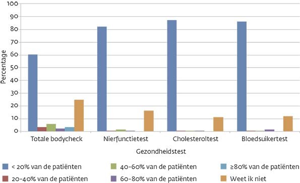 Op jaarbasis worden huisartsen gemiddeld zelden geconsulteerd naar aanleiding van een gezondheidstest of totale bodycheck. De tests waarvoor de meeste mensen de huisarts consulteren hebben betrekking op cholesterol (10 keer per jaar) en bloedsuiker (11 keer per jaar). Totale bodychecks en nierfunctietesten zijn bijna nooit aanleiding voor een consult (3 versus 4 keer per jaar). Het lage aantal consulten bij de huisarts staat in contrast met het aantal mensen dat aangeeft wel eens een gezondheidstest te doen. Een mogelijke verklaring is dat een gunstig testresultaat geen aanleiding is voor een huisartsenbezoek. En bij de niercheckcampagne uit 2006 bleek dat ook mensen met een ongunstige uitslag niet naar de huisarts gaan. Een andere verklaring kan zijn dat mensen hun testresultaten niet ter sprake brengen tijdens een consult.