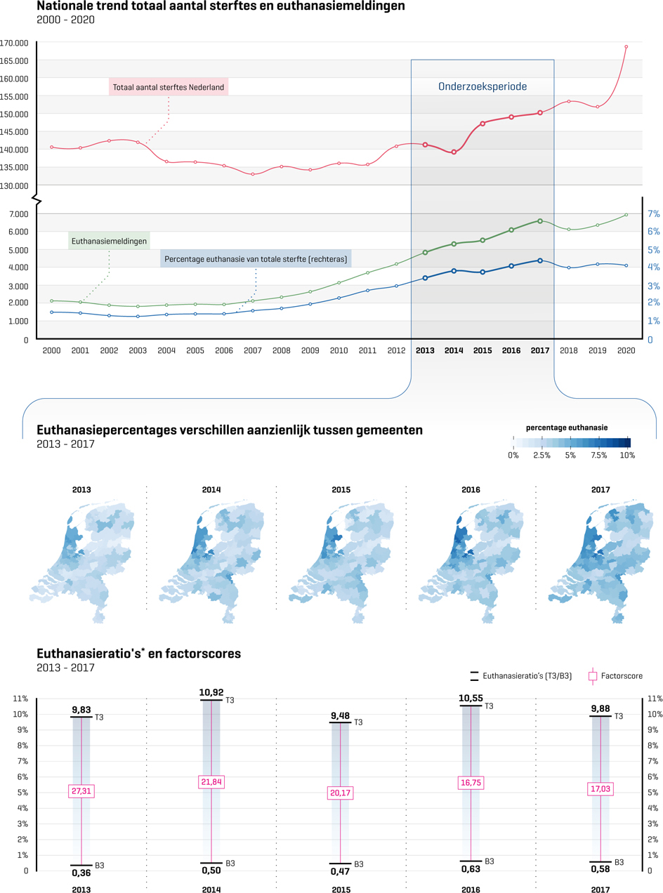 De gebruikte set van declaratiedata telt tussen 2013 en 2017 25.979 uitgevoerde euthanasieprocedures (oplopend van 4106 in 2013 naar 6460 in 2017). Het percentage door huisartsen verrichte euthanasieën liep op naar 4,3% van het totale aantal sterfgevallen. De gemiddelde leeftijd van de overleden patiënten nam toe van 71,3 in 2013 naar 73,2 in 2017.
