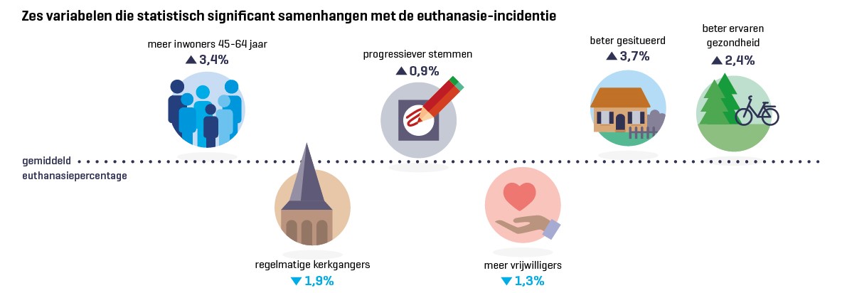 Er zijn 6 variabelen die statistisch significant samenhangen met de euthanasie-incidentie; zie de [infographic Variabelen] voor de factoren en bijbehorende percentages.
