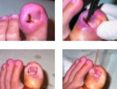 • De partiële nagelextractie met applicatie van fenol: de laterale rand van de nagel (tot onder de nagelriem) en het granulatieweefsel worden verwijderd waarna onder de nagelriem in het nagelbed een wattenstaafje aangebracht wordt waarvan de top in fenol 80% is gedoopt. Dit staafje blijft ten minste 3 minuten in situ. Na verwijdering worden de fenolresten uitgespoeld met 70% alcohol. ( foto)