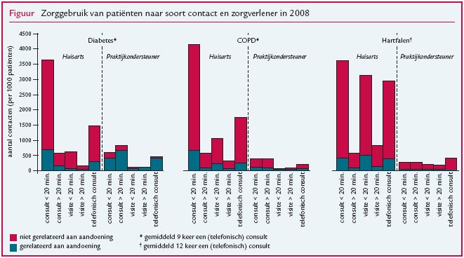 Deze patiënten hebben veel contact met de huisarts en de praktijkondersteuner. In 2008 hadden diabetes- en COPD-patiënten gemiddeld 9 keer een (telefonisch) consult of visite bij de huisarts of praktijkondersteuner en patiënten met hartfalen 12 keer (zie figuur). Het is opvallend dat slechts een klein deel van de zorg betrekking heeft op de specifieke aandoening. Het aantal contacten per 1000 ingeschreven patiënten dat dus kan worden bekostigd via integrale bekostiging voor diabetes, COPD en hartfalen is 195, dat is 28% van alle contacten voor deze patiëntengroepen (diabetes: 37%; COPD: 18%; hartfalen: 13%). Voor een gemiddelde fulltime huisarts zijn dit 453 contacten per jaar, iets meer dan 5% van alle contacten.