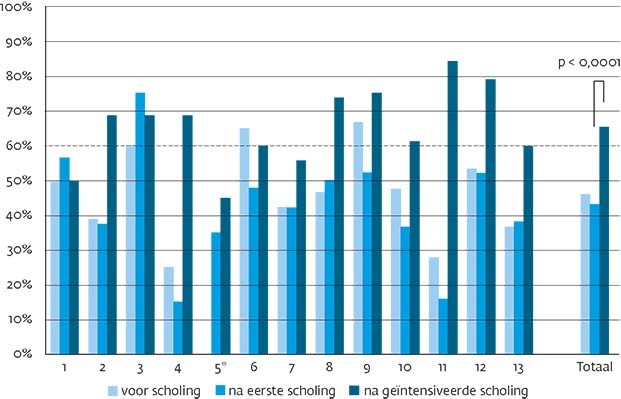 Om te kijken of de aanvullende scholingsinspanningen het gewenste effect zouden sorteren, trokken wij op exact dezelfde wijze als in het oorspronkelijke onderzoek steekproeven van gelijke omvang uit dezelfde 14 Cohesie-praktijken (minus één praktijk die geen medewerking meer verleende) en lieten deze op identieke wijze beoordelen door dezelfde longfunctieanalisten.1 De resultaten daarvan laten zien dat na de geïntensiveerde scholing in vrijwel alle praktijken de kwaliteit van de spirometrie aanzienlijk verbeterde [figuur]. Waar de aanvankelijke scholing géén effect had op de testkwaliteit, was dat na de geïntensiveerde scholing wel het geval: het gemiddelde percentage adequate tests steeg van 43% naar 65% (p &lt 0,0001 in een multilevel, logistisch regressiemodel), het aantal praktijken dat de prestatienorm haalde steeg van 1 (8%) naar 10 (77%).