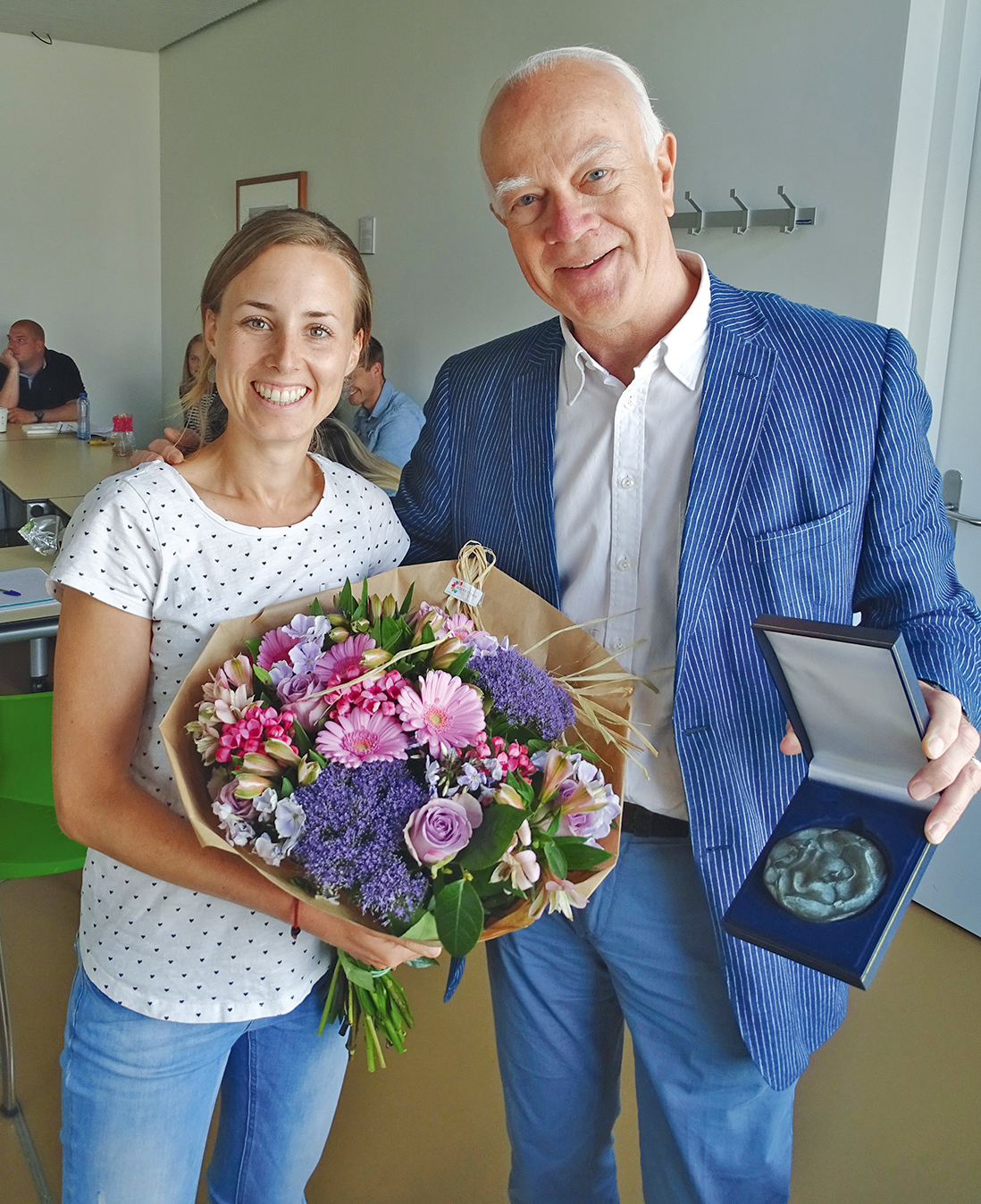 Annabel Jonkheijm ontvangt uit handen van hoofd huisartsopleiding Erasmus MC John van Ochten de Jan van Esprijs-penning en bloemen voor haar CAT D-mannose bij recidiverende urineweginfecties