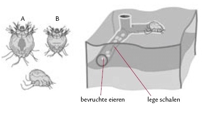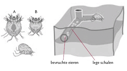 De vogelmijt – D. gallinae, ook wel bloedluis, duivenmijt of kippenbloedmijt genoemd – is een bloedzuigende parasiet van vogels.14 Vogelmijten maken gebruik van de nesten van wilde of tamme vogels en leven als parasieten van deze dieren. Zij leven in grote aantallen in vogelverblijfplaatsen, met name van pluimvee en duiven,1-3 maar niet op hun gastheer. Ze zijn erg lichtschuw, en houden zich overdag schuil in naden en kieren. ’s Nachts komen zij daaruit te voorschijn en voeden zich met het bloed van vogels; voor zonsopgang zijn zij weer verdwenen. Bij afwezigheid van de natuurlijke gastheer kunnen deze organismen ook tijdelijk op zoogdieren parasiteren, waaronder de mens. Invasie van woonhuizen of bijvoorbeeld kantoren vindt meestal plaats vanuit verlaten vogelnesten op zolder of onder een dak. Klassiek gebeurt dat in mei en juni, het seizoen dat vogels hun nesten verlaten. Hoewel zij mensen kunnen belagen en hun beten jeuk veroorzaken, blijven vogelmijten niet lang in leven bij de mens aangezien zij uitsluitend kunnen leven van vogelbloed.12 De huiduitslag betreft meestal jeukende rode papels van enkele millimeters in doorsnee. Het is ook mogelijk dat zich op de papel een vesikel ontwikkelt of dat er urticariële huidafwijkingen ontstaan. Urticariële maculae worden eveneens beschreven, maar deze komen minder vaak voor. De huiduitslag is morfologisch niet te onderscheiden van andere jeukende huidafwijkingen. De klinische verschijnselen bij vogelmijten zijn afhankelijk van het aantal aanwezige mijten en de individuele reactie van de gastheer op de beten. Er is geen specifieke voorkeurslocatie, maar meestal zitten zij op de huid die ‘s nachts onbedekt blijft. De vogelmijt heeft, in tegenstelling tot de schurftmijt, geen typische predelictieplaatsen tussen de vingers of ter hoogte van de pols en graaft ook geen kronkelige gangen in de hoornhuid. De huiduitslag betreft waarschijnlijk een allergische reactie op speekselbestanddelen van de mijt, een reactie die in verband met de optredende sensibilisatie heftiger wordt naarmate de infestatie langer duurt.2 De aandoening is ook als beroepsziekte beschreven bij kippenhouders en duivenmelkers. De huidafwijkingen deden zich bij hen met name voor aan handen en onderarmen.5 De diagnose wordt gesteld op basis van anamnese, lichamelijk onderzoek (huiduitslag) en bevestiging met behulp van microscopisch onderzoek. Als de huisarts vogelmijt vermoedt, is het raadzaam te vragen naar werk (pluimveehouders, dierenartsen), hobby’s (duivenmelken), huisdieren (met name de parkiet, kanarie en papegaai) en de aanwezigheid van vogelnesten op balkons, in dakgoten, onder de dakpannen of op zolders. De vogelmijten zijn ongeveer 1 mm groot en worden bij klachten vaak in groten getale gevonden in de (slaap)kamer. De mijten lijken nog het meest op kleine spinnetjes. Eén of liefst meerdere van deze mijten moeten dan ter identificatie worden opgestuurd naar het laboratorium. Hiervoor kan bijvoorbeeld een (droge) urinecontainer worden gebruikt. De vogelmijt is morfologisch goed te onderscheiden van mijten die schurft (Sarcoptes scabiei), schaamluis (Phthirus pubis) of hoofdluis (Pediculus humanus corporis) veroorzaken (figuren 2-4).6 De behandeling is symptomatisch en de klachten verdwijnen vanzelf indien de bron wordt opgeruimd. De bestrijding van een infestatie bestaat dus met name uit het verwijderen van de vogelnesten. Met het blote oog zichtbare mijten binnenshuis kunnen met een stofzuiger verwijderd worden, waarna de stofzak weggegooid moet worden. Textiel kan in de wasmachine bij 60 oC gewassen worden en daarna bij voorkeur in de wasdroger gedroogd. Textiel dat beter niet gewassen kan worden kan gedurende een dag in een afgesloten plastic zak worden bewaard, waarin een antimottendoos enkele uren wordt opengezet. Deze doos verdampt langzaam dichloorvos, een insecticide met een breed werkingsspectrum.7 Indien deze maatregelen niet afdoende zijn, moet de hulp van de gemeentelijke afdeling ongediertebestrijding ingeroepen worden. Als de mijten afkomstig zijn uit een kippen- of duivenhok, moet het nestmateriaal worden verwijderd waarna het hok grondig moet worden schoongemaakt en behandeld met een insecticide. Indien de schoonmaak overdag plaatsvindt, hoeven de dieren niet behandeld te worden daar de mijten overdag niet op de gastheer aangetroffen worden.