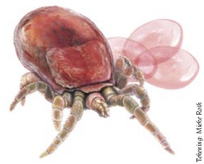 In september 2005 kwam mevrouw Van Kooten, 48 jaar, op het spreekuur. Zij had al een week last van gegeneraliseerde jeuk die steeds heviger werd. De jeuk was ’s nachts niet erger dan overdag. Bij lichamelijk onderzoek waren over het gehele lichaam, behalve het hoofd, uitgebreide papels en krabeffecten zichtbaar. Voor de differentiële diagnose dacht de huisarts(-in-opleiding, HL) allereerst aan schurft omdat gangetjes aanwezig leken aan beide onderarmen. Zij startte dan ook een lokale behandeling met lindaan en lidocaïne/levomentholsmeersel. De volgende dag verscheen patiënte echter opnieuw op het spreekuur met de mededeling dat ze in haar slaapkamer ‘kleine beestjes’ had zien kruipen. Ook vermeldde ze dat naast haar slaapkamerraam een boom stond met daarin een duivennest, maar dat de duif dood in haar nest lag. Ondertussen had zij op internet gezocht en bedacht dat het hier wellicht om de ‘duivenmijt’ kon gaan. Enkele van de ‘beestjes’ die vanuit het raam de slaapkamer binnenkropen had zij meegenomen en stuurde de huisarts op ter determinatie naar het Laboratorium voor Medische Microbiologie met vraagstelling: ‘Huiduitslag geduid als schurft; is er sprake van vogelmijt?’ Bij microscopisch onderzoek bleek het om mijten te gaan van ongeveer 1 mm groot die BD herkende als vogelmijten (Dermanyssusgallinae, figuur 1). De huisarts gaf patiënte het advies het duivennest te verwijderen en de slaapkamer grondig schoon te maken. Na ongeveer 5 dagen waren de jeuk en de huiduitslag verdwenen.