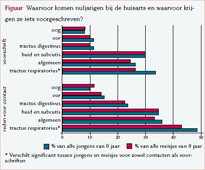 Tachtig procent van de baby's komt in het eerste levensjaar een keer bij de huisarts. Hierin verschillen de jongetjes niet van de meisjes. Huidproblemen, spijsverteringsklachten en aandoeningen uit het hoofdstuk ‘algemeen’ komen veel voor. Maar bijna de helft van alle baby's die de huisarts ziet, heeft luchtwegklachten en jongens weer vaker dan meisjes ( figuur). Deze verschillen zijn er niet voor de andere aandoeningen. Jongetjes komen vooral vaker dan meisjes voor hoesten (R05), acute bronchitis/bronchiolitis (R78) en astma (R96) ( tabel 1). Acute infecties van de bovenste luchtwegen (R74) komen het meeste voor. Daarin verschillen jongetjes en meisjes overigens niet.