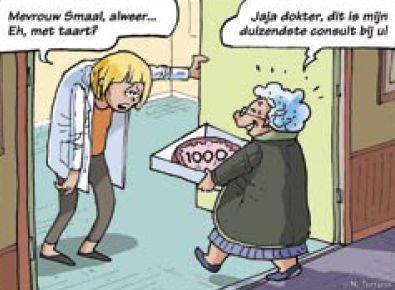 Terug naar verjaardagen. Elke verjaardag is een mini-jubileum. Tijd voor een bekentenis: ik heb jubileumallergie. En de prijs voor het ouder worden betaal je in jubileumvaluta. Het worden er namelijk steeds meer. Behalve de verjaardagen van gezins- en familieleden, zijn er die van vrienden en collega’s. Naarmate de jaren verstrijken, dringen de ‘echte’ jubilea sluipenderwijs je leven binnen. De ouders zijn zus- of zoveel jaar getrouwd, je viert je tienjarig bestaan als huisarts (ondanks alle verwoede pogingen dit vooral geheim te houden… er is altijd iemand die je ‘leuk verrast’ door daaraan te denken), trouwe patiënten vieren hun zilver- of goudkleurig huwelijk, en straks zijn er ongetwijfeld ook nog kleinkinderen. Deze lijst is nog lang niet volledig. O horror. En dan bestaat het NHG ook nog eens vijftig jaar, onze eeuwig jonge wetenschappelijke vereniging (waarmee ik - eindelijk - een paar woorden typ die mijn eindredacteur zeker niet zal schrappen of aanpassen) (Red.: de hatelijke aanhalingstekens rond ‘eeuwig jonge’ zijn geschrapt...). Het zij het NHG gegund, natuurlijk. En die terughoudendheid in jubileumzaken ligt aan mij, beweert trouwens ook mijn vrouw. Als anderen zijn aangestoken door jubileumkoorts, trek ik mij meestal terug, met of zonder smoes. Uitzinnig feestvieren is niets voor mij. Dat zegt dus niets over de feestvierders, maar alles over ondergetekende. Waar komt die allergie vandaan? Koppigheid? Dat kan. Eigenwijsheid? Wis en drie. Maar ik denk zelf dat het complexer ligt. Ik houd in het leven van de onverwachte wendingen, ten goede en ten kwade. Het volle leven, zogezegd. En jubilea doen alles zoveel eenvoudiger lijken, alsof het leven al bijna achter de rug is. Laten wij wel wezen: ieder mens, elke organisatie, hoort graag anekdotes over zichzelf. Brokstukken die langzaam maar zeker de vorm aannemen van een kleine geschiedenis. Verhalen die door de jaren heen een eigen mythe worden, omgevormd tot liedjes op een trouwpartij, en eventueel nogmaals gerecycled bij een gouden huwelijksfeest. Van dat proces gruw ik. Al wens ik de feestvierders natuurlijk van harte een hoge jubileumkoorts! Iemantsverdriet