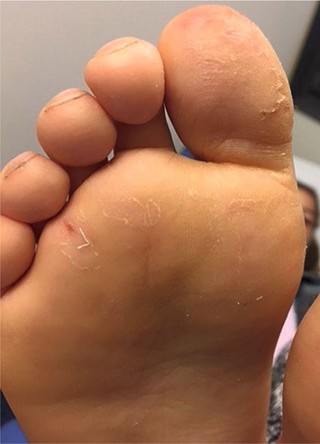 Figuur 2 | Kenmerkend voor juveniele plantaire dermatose zijn schilfers en pijnlijke kloven op de plantaire zijde van beide grote tenen en voorvoeten
