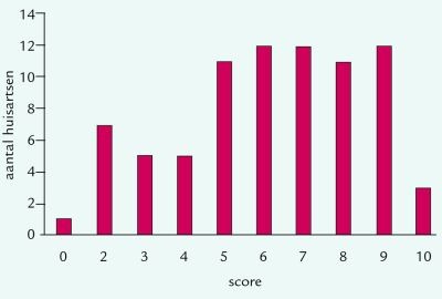 Voor elke vraag waren maximaal 2 punten te behalen, zodat de maximale score van de toets 10 punten was. De figuur geeft een overzicht van de totaalscores van de opleiders.