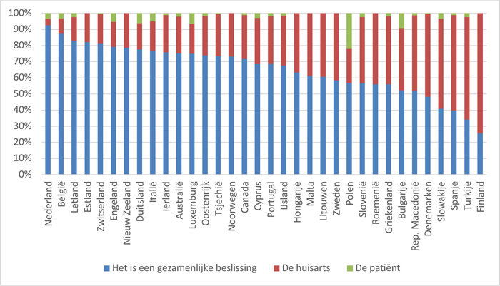 Nederlandse patiënten zijn positief over hun betrokkenheid bij de beslissingen die tijdens het consult worden genomen. 9 Dat geldt ook voor verwijsbeslissingen. Meer dan in enig ander land antwoorden Nederlandse huisartsen (92%) dat ze een beslissing over een verwijzing samen met hun patiënt nemen [figuur 1]. De Nederlandse huisartsen betrekken de voorkeur van de patiënt ook vaker bij de keuze van een zorgaanbieder. Deze manier van werken bleek in landen met een poortwachterssysteem gebruikelijker dan in andere landen. 10