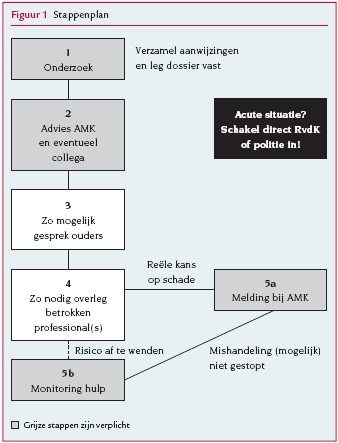 De vertrouwensrelatie tussen (huis)artsen en hun patiënten vormt een belangrijke belemmering om een vermoeden van kindermishandeling te bespreken met een patiënt. Huisartsen zijn bang dat de ouders hen gaan mijden als zij zorgen uiten over de gezinssituatie. Veel artsen voelen zich belemmerd om hun zorgen met anderen te delen. Zij beseffen dat zij hun beroepsgeheim schenden als zij hun zorgen met derden delen zonder toestemming van de patiënt. Deze vrees is echter ongegrond. De Wet op de Jeugdzorg regelt dat beroepsbeoefenaren met een beroepsgeheim gegevens mogen verstrekken aan het Bureau Jeugdzorg, in het bijzonder het AMK, als dit noodzakelijk is om kindermishandeling te stoppen of een redelijk vermoeden daarvan te laten onderzoeken.2 Het belang van het kind gaat dan boven het beroepsgeheim. In Nederland kennen we een meldrecht ten aanzien van kindermishandeling en geen meldplicht. De afweging om te melden blijft de individuele verantwoordelijkheid van de arts. Sinds 2002 bestaat de KNMG-meldcode kindermishandeling.14 In de eerste versie lag het accent op ‘zwijgen, tenzij’. Dit leek de vrees van artsen om het beroepsgeheim te schenden te bevestigen.15 De nieuwe meldcode van 2008 heeft als richtlijn ‘spreken, tenzij’.16 Deze code is directiever. Een stappenplan (figuur) helpt de arts met de afweging of hij (vermoedens van) kindermishandeling moet melden.716 Nieuw is de monitorfunctie van artsen: de (huis)arts beoordeelt zelf of via anderen in hoeverre de ingezette vrijwillige hulpverlening het beoogde effect heeft of het risico op schade afwendt. Zo niet, dan meldt de arts alsnog.