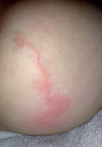 Als huisarts (AU) zag ik bij mijn 2-jarige zoontje een streepvormige afwijking van 1 cm lengte op zijn linkerbil. Ik dacht in eerste instantie aan een kras, totdat vier dagen later de streep was gegroeid tot 10 cm [foto]. Hij was niet ziek, had geen koorts en leek er geen pijn of jeuk aan te hebben. Hij was niet onlangs in het buitenland geweest. Een dag later heb ik een foto van de huidafwijking voorgelegd aan de dermatoloog (BvB) die dienst had op de buitenpoli vlakbij onze praktijk. Hij diagnosticeerde kruipworm (larva migrans) en adviseerde om het uiteinde van het gangetje aan te stippen met stikstof. Eenmalig aanstippen was al effectief: het gangetje is niet verder gegroeid en verdween in de weken erna.