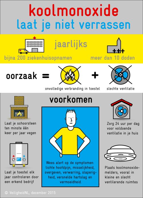 In Nederland overlijden per jaar vijf à tien mensen aan de gevolgen van een CO-intoxicatie. Daarnaast zijn er ongeveer 200 ziekenhuisopnames en worden enkele honderden mensen op een SEH behandeld.1 Grote boosdoeners zijn oude, niet goed onderhouden cv-ketels en open verbrandingsinstallaties in woningen, zoals afvoerloze geisers, open haarden, gaskachels en gasfornuizen, soms in combinatie met gebrekkige ventilatie. Er zijn ook steeds vaker CO-intoxicaties bij (veelal jonge) waterpijprokers. Een waterpijpsessie van een half uur staat gelijk aan het roken van 100 sigaretten. Uit onderzoek blijkt ook dat de CO-concentratie in het bloed van waterpijprokers vaak verhoogd is.2