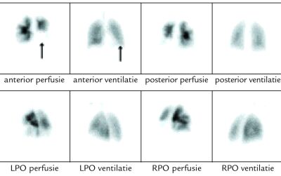 Bij longembolie hebben anamnese, lichamelijk onderzoek, ECG en X-thorax tezamen een sensitiviteit van 38% en een specificiteit van 33%. 18A Een ventilatie-perfusiescan (of perfusiescintigrafie) is bij verdenking op longembolie het aangewezen onderzoek. Bij een acute longembolie is er sprake van (sub)segmentaal begrensde perfusie-uitval, wat zich uit in ‘defecten’ op de perfusiescan, terwijl de ventilatie in de longen geheel normaal is. Dit verschijnsel heet mismatch: afwezige perfusie bij normale ventilatie ( figuur 2 ). Bij multipele of grotere segmentale perfusiedefecten met normale ventilatie is de kans op embolie zeer hoog (>90%) en wordt meteen gestart met antistollingstherapie. 20 Bij kleinere perfusiedefecten (subsegmentaal) of grotere defecten met overeenkomstige ventilatieafwijkingen of afwijkingen op de thoraxfoto is de kans hierop kleiner. 18