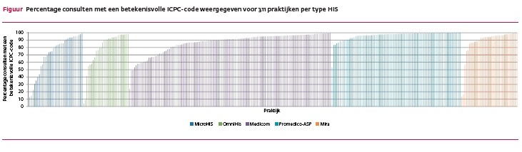 De [figuur] toont de resultaten, waarbij iedere kleur een ander type HIS representeert. De [tabel] toont gemiddelden en standaarddeviaties per type HIS. De 311 praktijken kenden bij gemiddeld 86% van de korte en lange consulten een betekenisvolle ICPC-code toe. De [figuur] laat zien dat er duidelijke verschillen tussen HISsen bestaan, zowel in de gemiddelden als in de variatie tussen praktijken.